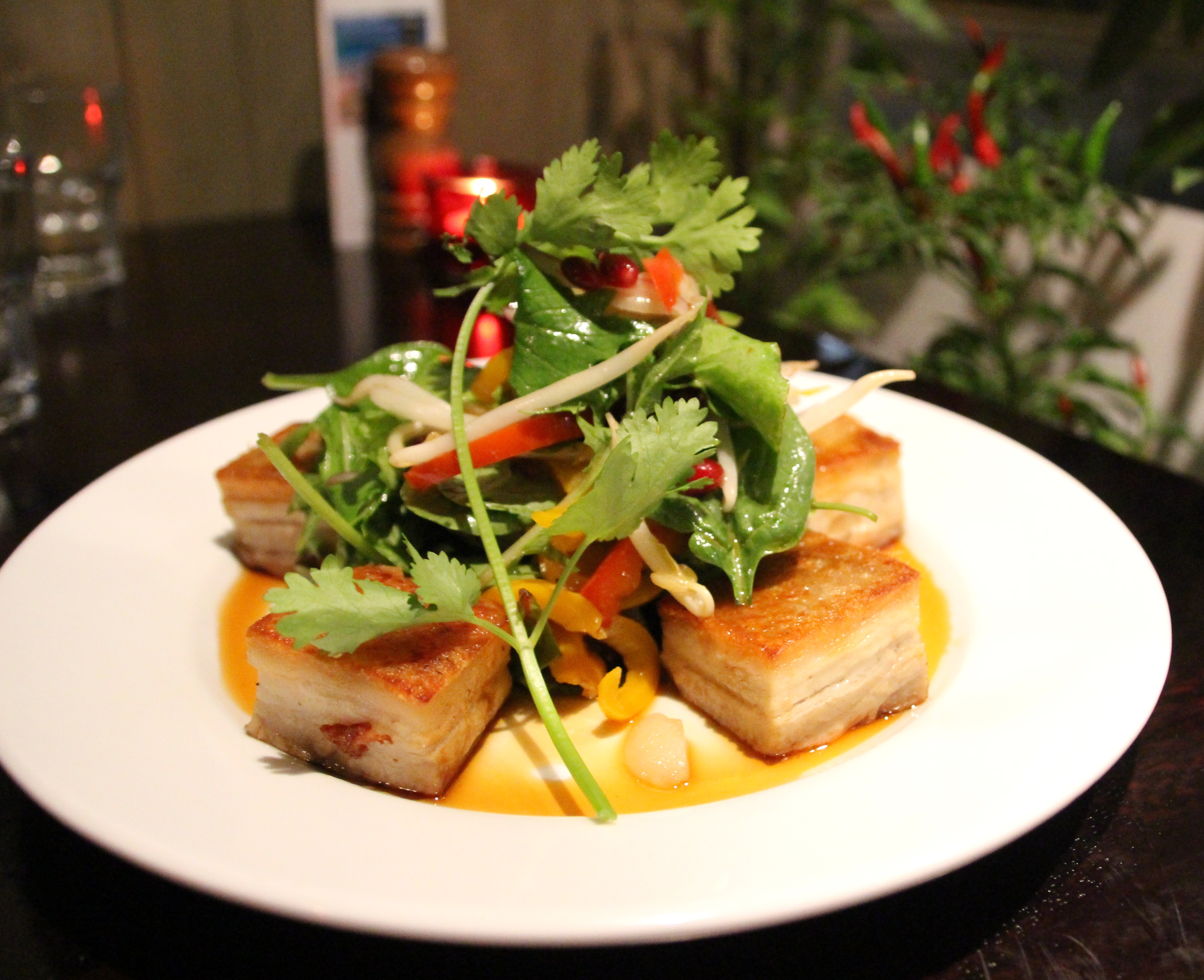 I really enjoyed the chili caramel glazed pork belly ($35). I just can’t go past a bit of crackling! The crunchy Asian salad that accompanied it was dotted with little gems of pomegranate and coated with a Thai dressing, with a fresh zing of lime. It was a very tasty dish.