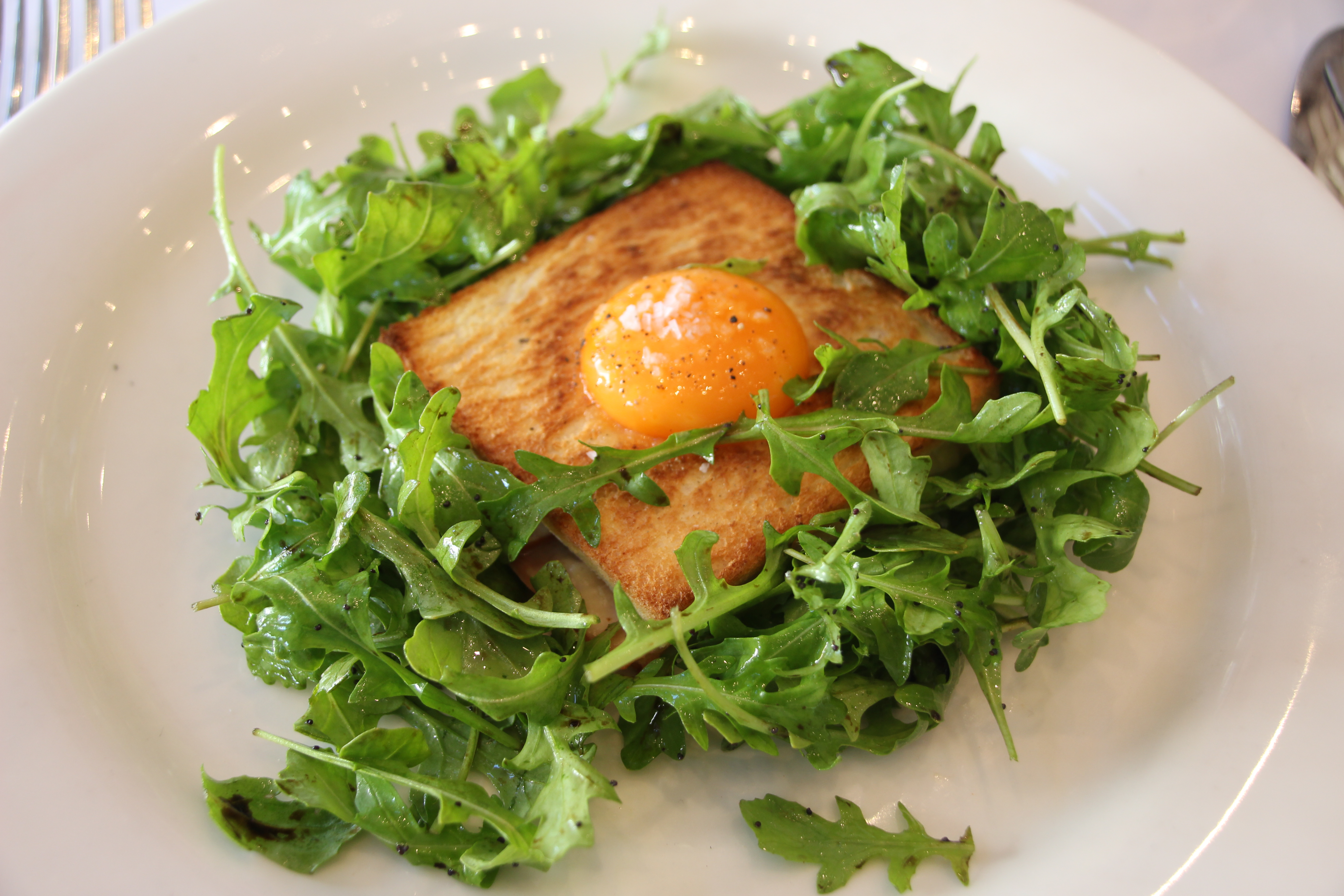 Though the Croque-Monsieur is essentially a ham and cheese toasted sandwich typically made with a bechemal sauce, I am keen to try something that is a staple on Parisian bistro menus. This version, usually called a Croque-Madame, is topped with a poached egg. As it is truffle season, I add truffle, for an extra charge of $10. I love the addition of this pungent, earthy flavour; it makes the Croque Monsieur feel decadent. The crisp, butteryness of the toast, the oozing egg yolk and the generous shavings of truffle, is a really great way to start lunch.